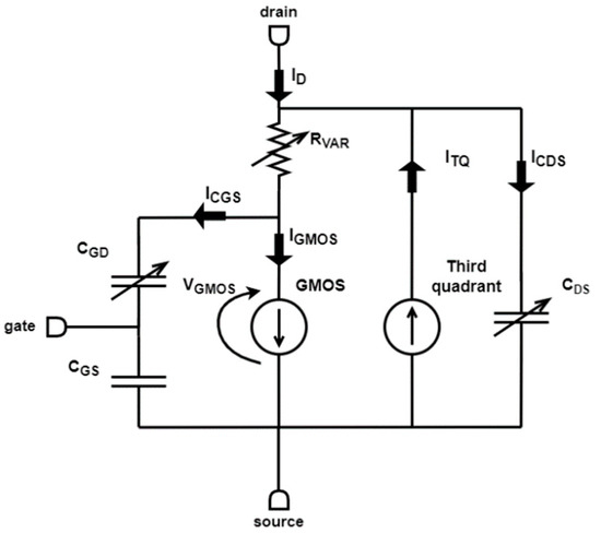 Figure 2 shows a typical representation of the component. The blocks named GMOS, RVAR, and third quadrant emulate the static characteristics of the device; the CGS, CGD, and CDS blocks, instead, emulate the dynamic ones. The current IGMOS is set using the equation implemented in the GMOS block. The equations implemented on these blocks usually include some fitting parameters properly set to obtain a good match between the datasheet characteristics and the simulated ones.