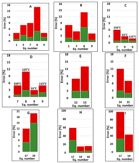 where the target is: the published measurement data when available in the original paper; otherwise, the datasheet information (p indicates the p-th point in the characteristic curve; NP is the number of points). Figure 4 shows the computed average (computed using (2)) and maximum (maximum value of Errp) errors. Each bar represents the percent error obtained for the labeled equations (x-axis). The bars related to the maximum error (red) are located behind the ones related to the average (green) value. For example, the label “1” in Figure 4A represents the use of Equation (1) for the device whose simulated and target curves are reported in Figure 3A. The related bars show the average (1%) and maximum (4%) error between the simulated and target curves computed by using (2).