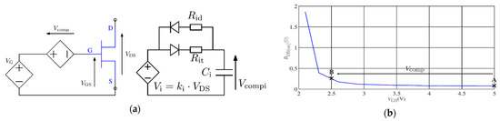 Dynamic RDS,on has not been fully taken into account in the circuit model of GaN HEMT, but it is of extreme importance to improve its accuracy. A first modeling approach for the dynamic RDS,on is reported in [43], but it only accounts for the off-state voltage and off-time. In such a work, the variation of the static RDS,on with varying VGS is first measured. Moreover, the device’s dynamic RDS,on is characterized by varying the aforementioned off-state quantities. Then, the circuit model (Figure 6a) emulates the dynamic RDS,on by varying the static one by, in turn, varying the VGS (Figure 6b). In the auxiliary circuit on the right in Figure 6a, the voltage source, Vi, controlled by VDS is defined by the following equation: