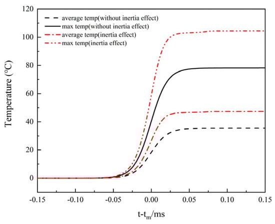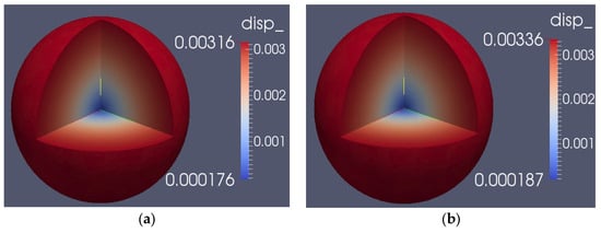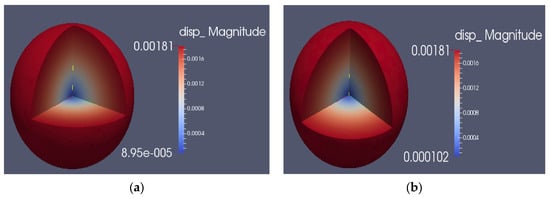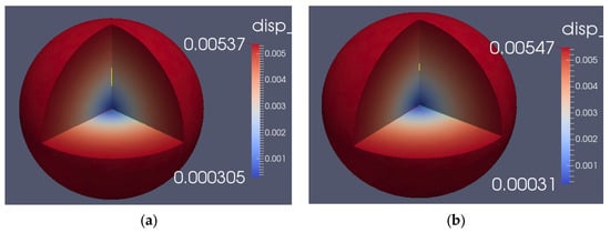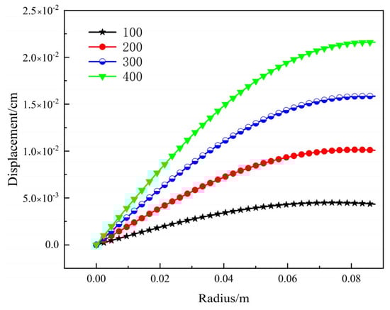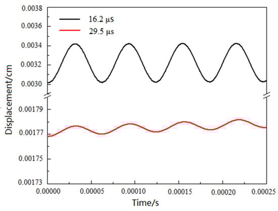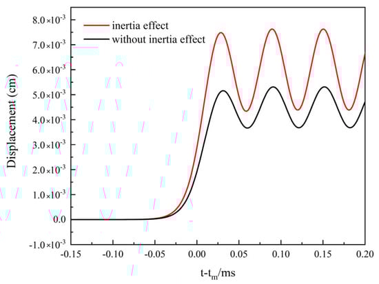The displacement distribution of the initial pulse period of 16.2 μs is shown in Figure 23. It is observed that the core displacement is minimum at the center and maximum at the surface, which is consistent with the previous calculations for the initial pulse period of 16.2 μs and 29.5 μs. On the other hand, Figure 24 demonstrates the variation of the outer surface displacement with time. The results indicate that the outer surface displacement exhibits an oscillatory variation over time. It is noteworthy that the maximum displacement is 5.32 × 10−3 cm when the inertial effect is not taken into account and 7.63 × 10−3 cm when it is considered. Consequently, the maximum displacement on the outer surface with the inertia effect is 1.43 times greater than without the inertia effect. Hence, it can be observed that the inclusion of the inertia effect leads to a substantially higher core displacement in comparison to when the inertia effect is not considered.