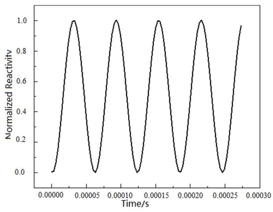 Since the quench coefficient varies with time and is no longer a constant, the point reactor kinetic equations need to be solved again. The reactivity expression of the fast pulsed reactor is given using Equation (12). In consideration of the elastic oscillation of the surface displacement, we also consider the quench coefficient as a function of the oscillation with time. To obtain the thermal expansion characteristics of the fast pulsed reactor, a displacement oscillation curve is used. The curve of the quench coefficient with time is derived by selecting the region where the displacement oscillation is stable.