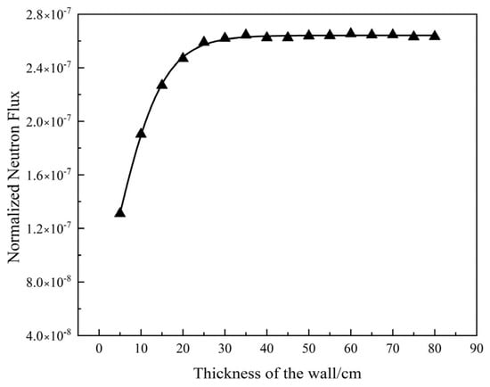 To address the issue of long calculation time associated with the use of actual wall thickness in the Monte Carlo method, an alternative approach utilizing the "saturated wall thickness" is employed. This involves calculating the scattered neutron saturation wall thickness using the F4 card and CF4 card of MCNP, with the wall positioned 6 m from the core. The scattered neutron intensity calculation is then performed at a distance of 10 cm from the wall, with the wall thickness ranging from 5 cm to 75 cm. The neutron flux is tallied every 5 cm, and the results are depicted in Figure 6. It can be observed that the intensity of scattered neutrons initially increases gradually with the wall thickness but eventually stabilizes and remains essentially constant as the thickness continues to increase. In light of these findings, the surrounding walls, ceiling, and floor are all set to a uniform thickness of 70 cm instead of their actual dimensions. This adjustment significantly enhances the calculation speed without compromising accuracy. Consequently, this standardized thickness is referred to as the “saturated scattered neutron wall thickness” of 70 cm.
