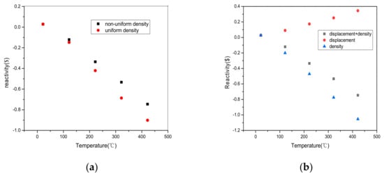 To determine the quench coefficient and reactivity temperature coefficient, the displacement and density distribution along the radius at different initial temperatures are first obtained; for the detailed density distribution, the 100-layer sphere model is created, and each grid element is set to the corresponding density so that the density achieves a non-uniform distribution, the reactivity at different temperature is calculated using MCNP. Using the linear fitting method, the αT0 at the center can be calculated, and the average reactivity temperature coefficient αT is achieved according to Equation (7), then the quench coefficient is obtained using Equation (11).