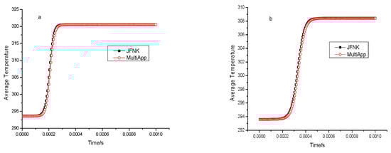 The burst pulse process simulation of the Godiva-I at different initial reactivity periods is performed using the transient power density distributions as a known time-dependent heat source, which are loaded into the thermal-mechanical calculations of the MOOSE platform (Gaston D, Newman C, Hansen G, et al., 2009) []. The core’s heat transfer calculation is based on the Heat Conduction module in MOOSE, while the mechanical calculation is based on the Tensor Mechanics module. The coupling of different physical processes is realized using the JFNK or MultiApp method in MOOSE, and each process is shown in Figure 2. JFNK, which is a direct method, uses the unified matrix to solve thermal-mechanical coupling formulas. On the other hand, MultiApp is an indirect method that only executes one thermal calculation and one mechanical calculation without any coupling between these two fields. In the JFNK approach, the temperature field and stress field are obtained directly, whereas, in the MultiApp approach, the heat transfer calculation is used as a MasterApp, and the mechanic calculation is used as a subApp. The temperature transfer from Heat Conduction to Tensor Mechanics is achieved via Transfer. Consequently, the temperature field is obtained first, followed by the stress field. The calculations are performed with an initial time of 0.00 s, a step size of 5.0 × 10−6 s, and an end time of 1.0 × 10−3 s, which is divided into 200-time steps.