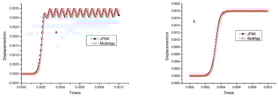 Distribution of Displacement at 16.2 μs initial reactivity period. (a) JFNK; (b) MultiApp.