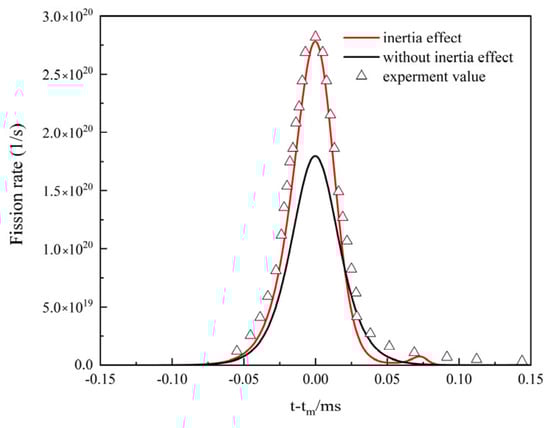- The inertia effect calculation shows that when the initial period is 11.6 μs, the peak value of the fission rate is 2.78 × 1020/s, and the relative deviation of the experimental value is −1.35%; the average temperature rise and the maximum temperature rise of the core are 47.34 °C and 104.53 °C, which is about 1.3 times of that without considering the inertia effect; The maximum displacement on the outer surface is 7.63 × 10−3 cm which is about 1.43 times without considering the inertia effect. In conclusion, the inertia effect can significantly increase the core fission yield and increase the temperature and displacement of the core.