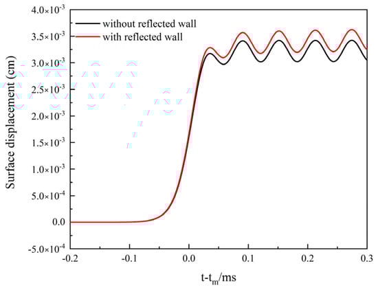The displacement distribution of the initial reactivity period of 16.2 μs is shown in Figure 28 after considering the reflected neutrons. The core exhibits the same displacement expansion trend as when the reflected neutrons from the walls are not considered. Figure 29 demonstrates a significant oscillation in the core. The maximum surface displacement for the initial reactivity period of 16.2 μs is 3.63 × 10−3 cm, whereas the maximum surface displacement without considering the reflected neutrons is 3.42 × 10−3 cm. In summary, the inclusion of reflected neutrons leads to a slowdown in pulse trailing edge decay, an increase in pulse ping power, an expansion of pulse width, and a rise in fission yield. Additionally, considering reflected neutrons results in an increase in core temperature, stress, and displacement compared to not considering reflected neutrons.