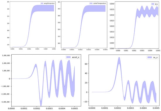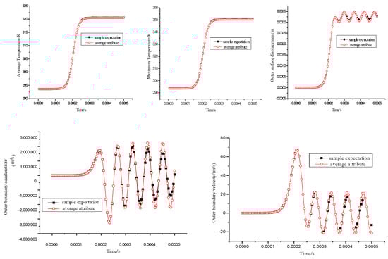 In this paper, the spectral distributions of the values of these five response quantities at the last time step are statistically presented in the form of histograms, as shown in Figure 33. The histogram distributions of the average temperature, maximum temperature, and outer boundary displacement are approximately Gaussian, indicating their better linear characteristics and consistency with the material properties’ distribution. However, the histogram distributions of the velocity and acceleration of the outer boundary show greater deviations from the Gaussian distribution. Specifically, the velocity distribution is similar to the beta distribution, while the acceleration distribution is similar to the Poisson distribution. These differences in distribution indicate that the nonlinear characteristics of the two responses are not the same.