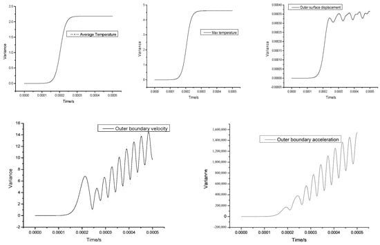Variation of sample mean temperature, maximum temperature, outer surface displacement, outer boundary velocity, and outer boundary acceleration variance with time.