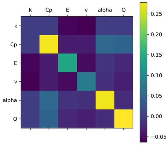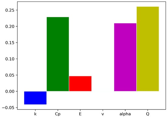 Figure 34 shows the distribution of the first-order and second-order sensitivity coefficients for the input parameters under the outer surface displacement response volume, taking the sensitivity coefficient between the external surface displacement and material properties at the last time step as an example. In this figure, the diagonal term represents the first-order sensitivity coefficient, while the non-diagonal term represents the second-order sensitivity coefficient. It can be observed that the external surface displacement is more sensitive to the specific heat capacity (Cp), thermal expansion coefficient, and heat source magnitude factor. Additionally, the second-order sensitivity coefficient of specific heat capacity shows a stronger relationship with both the thermal expansion coefficient and heat source amplitude factor. The remaining sensitivity coefficients are essentially zero, and any negative values in the table are due to the small sample size. In reality, these negative values would be very close to zero. Furthermore, Figure 35 presents the distribution of the total sensitivity coefficients for each parameter. The analysis of this figure reveals that the sensitivity coefficients, ranked by importance, are as follows: heat source amplitude factor, specific heat capacity, and thermal expansion coefficient for the response quantity of external surface displacement.