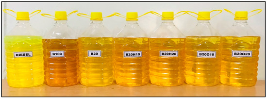 Ternary fuel samples were prepared using the splash blending method, incorporating conventional diesel fuel (D100) as a reference. To prepare binary blend B20 and ternary blends B20H10, B20H20, B20O10, and B20O20, the volume percentages of 1-heptanol and n-octanol were increased from 10% to 20%. The properties of higher alcohols are presented in Table 1. The binary and ternary blends were selected after conducting pilot experiments at the research laboratory. Magnetic stirring was employed to ensure blend quality. The fuel samples were stored in sealed bottles under laboratory conditions for one week at 27 °C without phase separation as shown in Figure 1.