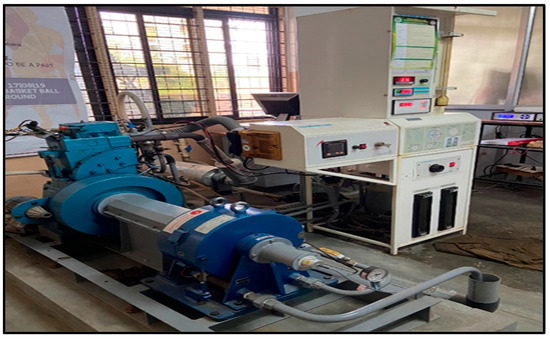 The engine performance, exhaust gas emissions, and combustion characteristics of the prepared fuel blends were evaluated at the Biodiesel Research and Demonstration Centre, located at Vidyavardhaka College of Engineering in Mysuru, Karnataka, India. The testing was conducted on an engine test rig using a single-cylinder, four-stroke, naturally aspirated, water-cooled computerized engine. This engine had a bore of 87.5 mm, a stroke of 110 mm, and a capacity of 661 cc. The overall dimension of an engine is W 2000 × D 2500 × H 1500 mm. Detailed technical specifications of the engine can be found in Table 2. The experimental set-up and measurement system are depicted in Figure 2, while a photograph of the test rig is provided in Figure 3.