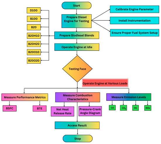 In order to establish steady conditions, the process begins with a 15 min engine warm-up, utilizing just 100% diesel fuel. After achieving consistent conditions across all tested fuels, trials occurred within a temperature range of 25–27 °C and a humidity range of 55–60%. Diesel fuel was used as the reference. Engine performance, emissions, and combustion were evaluated under different loads (25%, 50%, 75%, and 100%) at a steady speed of 1500 rpm. The CP data were meticulously collected for each working cycle, spanning a 720° crank angle with precise 1° intervals for all loads. Averaged pressures for tested fuels were derived from a minimum of 25 cycles, using adept filtering. The “Engine Soft” software enabled comprehensive engine assessment, with each test conducted thrice for accuracy. Data were collected on an assortment of parameters, including current, voltage, temperatures, pressures, air and fuel mass flow rates, and the composition of exhaust gases. The same approach described above is used to test the binary (B20) and ternary blends (B20H10, B20H20, B20O10, and B20O20). After each fuel blend test, the fuel line was cleansed with pure diesel. Key variables such as brake power, thermal efficiency, fuel consumption, and combustion characteristics were computed using an in-depth analysis of the collected data. Throughout, strict adherence to safety protocols ensured the reliability and legitimacy of outcomes. The methodology employed to perform experiments and analysis is illustrated in Figure 4.