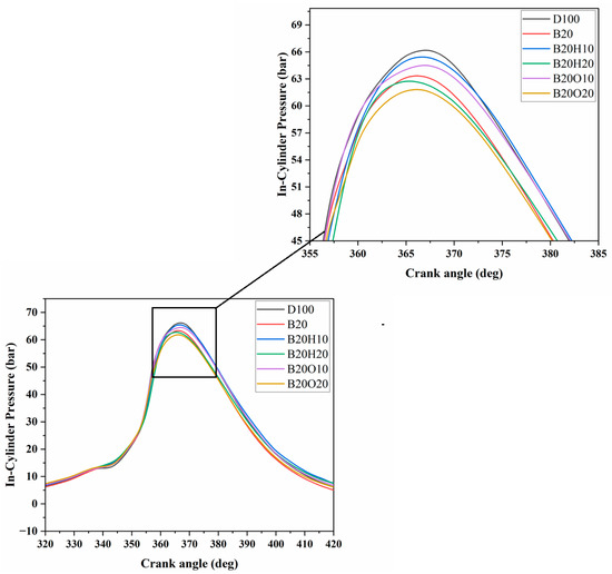 CP was examined in order to comprehend the mechanism underlying the combustion of the composite biodiesel in ICEs. The amount of fuel used during uncontrolled combustion has a negative effect on the CP. Figure 5 shows the trends of the pressure in the cylinder changes for different fuel samples when the engine is run at full load. At 100% engine load, the highest pressure in the cylinders was 66.18 bar for diesel fuel, 63.34 bar for B20, 65.42 bar for B20H10, 62.73 bar for B20H20, 64.51 bar for B20O10, and 61.82 bar for B20O20. At the TDC, when the crank angle was between 5° and 8°, these highest pressures were observed. The highest peak CP was achieved with diesel fuel (DF), and this can be attributed to its superior calorific value and efficient fuel atomization. Diesel fuel consistently displayed the highest in-cylinder pressure profiles in all engine load situations because of its higher calorific value (42.54 MJ/kg) and superior fuel atomization characteristics (Table 1). The trends of the peak in-cylinder gas pressure at the lower alcohol fractions slightly decreased when 10% of 1-heptanol and n-octanol was added to the diesel/biodiesel fuel blend. This may be due to 1-heptanol having a lower auto-ignition temperature than n-octanol (270 °C), as shown in Table 1.