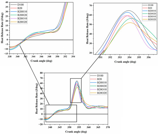 Figure 6 illustrates the NHRR at full engine load. The NHRR test was influenced by the test fuels’ calorific value, volatile matter, cetane number, oxygen concentration, viscosity, density, and length of fuel injection [69]. Conventional diesel fuel consistently exhibited the highest peak heat release rate among all fuel samples at various engine loads. This can be attributed to its superior energy content and better fuel atomization characteristics. The highest NHRR values for D100, B20, B20H10, B20H20, B20O10, and B20O20 fuels at maximum engine load were estimated to be 64.65 J/deg, 59.07 J/deg, 62.34 J/deg, 56.12 J/deg, 57.95 J/deg, and 51.9 J/deg, respectively, and the corresponding graphs are displayed in Figure 6. A lower (10%) amount of 1-heptanol and n-octanol in the diesel/biodiesel blend gradually improves some parameters, such as fuel atomization and blending capabilities. Notably, 1-heptanol (39.92 MJ/kg) and n-octanol (38.53 MJ/kg) have higher calorific values than hybrid biodiesel. Because of its lower blending percentage with diesel and specific physicochemical properties, such as cetane number, viscosity, and density, the hybrid biodiesel blend (B20) has lower net heat release rates than unmodified diesel fuel and also low percentage blends of 1-heptanol and n-octanol mixtures (B20H10 and B20O10). However, there is no substantial improvement in heat release rate statistics when the diesel engine is fuelled with higher percentages (20%) of n-octanol to the diesel/biodiesel blend fuels (B20O20). This is mostly due to decreases in net heat release rate (51.9 J/deg) caused by excess oxygen in the structure lowering the temperature inside the cylinder, as well as the previously noted less excellent fuel qualities.