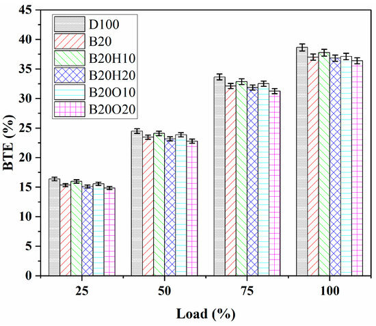 The terms QLHV, Pe, and mfuel depict the lower heat value of a fuel, effective engine power, and mass fuel consumption, respectively. Figure 7 illustrates the variation in BTE with engine load at a constant speed of 1500 rpm for diesel fuel and binary and ternary mixtures. At the maximum load, the BTE values for diesel fuel, B20, B20H10, B20H20, B20O10, and B20O20 were 38.65%, 37.01%, 37.76%, 36.84%, 37.12%, and 36.38%, respectively. According to the findings of other researchers [19,28,59], as the engine load increases, there is a fractional increase in BTE for all fuel samples following a direct proportionality between BTE and engine load. The decline in BTE for diesel/biodiesel and ternary blends of 1-heptanol and n-octanol is due to their reduced energy content and unfavourable combustion characteristics. Table 1 highlights that diesel fuel has a higher heating value (42.54 MJ/kg) than biodiesel (38.91 MJ/kg), 1-heptanol (39.92 MJ/kg), and n-octanol (38.53 MJ/kg). The improvement of fuel atomization and the air/fuel combination, which impacts BTE, is significantly influenced by changes in viscosity, surface tension, and density.