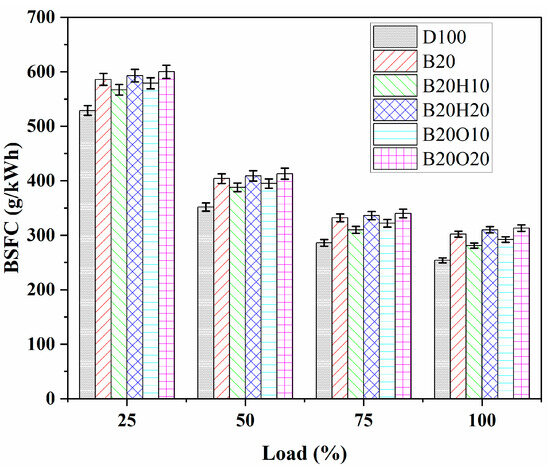 BSFC measures the fuel needed to produce 1 kW of power per hour in internal combustion engines (ICEs). It is related to effective engine power and mass fuel consumption, and, interestingly, it has an inverse relationship with BTE for the fuels used [78]. BSFC plays a crucial role in fuel selection for engine evaluation. Figure 8 illustrates the results of BSFC for all tested fuel samples at varying engine loads. At 100% engine load, the BSFC values were 254.1 g/kWh for diesel fuel, 302.14 g/kWh for B20, 281.25 g/kWh for B20H10, 310.94 g/kWh for B20H20, 292.8 g/kWh for B20O10, and 313.80 g/kWh for B20O20. The BSFC decreases with increasing engine loads. Diesel fuel exhibits a lower BSFC compared to binary blends and ternary blends of 1-heptanol and n-octanol due to its higher energy content and BTE (Figure 7).