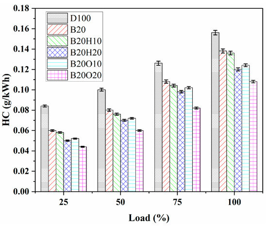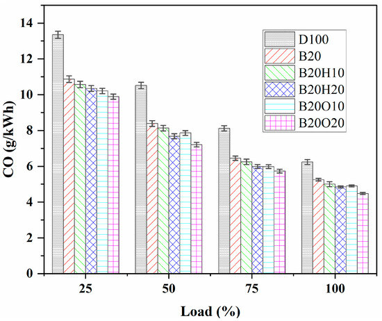 The maximum unburned HC emissions were recorded for different fuel samples: D100, B20, B20H10, B20H20, B20O10, and B20O20, with values of 0.156 g/kWh, 0.138 g/kWh, 0.136 g/kWh, 0.12 g/kWh, 0.124 g/kWh, and 0.108 g/kWh, respectively. These findings align with prior investigations involving various higher alcohols, where their presence in the fuel samples facilitated specific reactions within the combustion chamber due to increased temperatures, impacting HC emissions. In conclusion, HC emissions were substantially higher for all tested fuels compared to B20O20 fuel, which comprised 20% n-octanol, 20% biodiesel, and 60% diesel fuel. However, they showed slightly lower HC emissions than traditional diesel fuel at nearly all engine loads (refer to Figure 9). These findings highlight the potential benefits of certain fuel blends for reducing HC emissions and improving overall engine efficiency. Deep et al. [85] also observed a comparable trend when blending 1-octanol with diesel in volumes ranging from 10% to 40%. In a study by Mahalingam et al. [86], the addition of 10% and 20% pentanol to neat biodiesel resulted in a decrease in HC emissions of 2.1% and 3.6%, respectively, compared to B100 at all engine loads. Similarly, Babu et al. [87] found that a blend of 85% biodiesel, 5% diesel fuel, and 10% n-pentanol exhibited the lowest HC emissions among other ternary blends. At 100% load, this blend released 74 ppm, which was 39.4% lower than diesel fuel emissions.