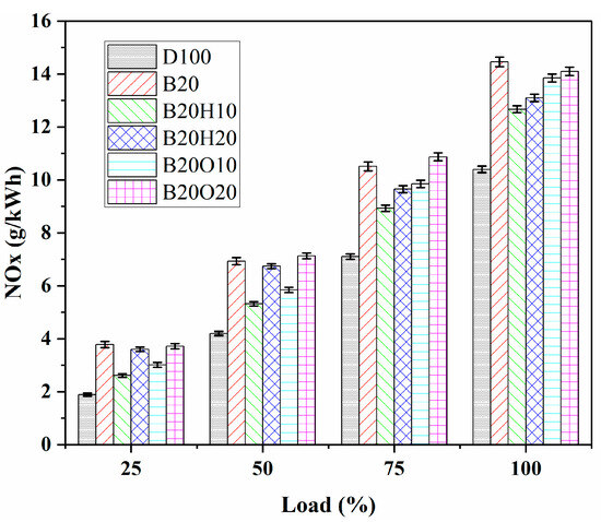 The term oxides of nitrogen refer to NOx, including many different nitrogen compounds, such as nitrogen monoxide (NO), nitrogen dioxide (NO2), nitrous oxide (N2O), dinitrogen dioxide (N2O2), dinitrogen trioxide (N2O3), dinitrogen tetroxide (N2O4), and dinitrogen pentoxide (N2O5). However, it is widely recognized that more than 90% of NOx emitted from a CI engine consists of NO gas [88]. The air/fuel ratio, compression ratio, temperature, fuel injection pressure, engine speed, and load are few factors that affect the formation of NO [71]. Diesel fuel has lower NOx emissions because of combustion efficiency indices like a higher combustion chamber temperature, a faster flame, better thermal efficiency, and fewer oxygen molecules, as well as a higher energy content [89].