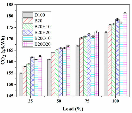 Higher oxygen content supports complete combustion leading to increased CO2 emissions. The presence of oxygen atoms promotes complete reactions and raises CO2 emissions in the exhaust. The hydroxyl radical OH, an essential oxidizing agent, converts CO to CO2 gas when sufficient oxygen is available [91]. Figure 11 illustrates the variation in CO2 emission values in g/kWh with engine load at a constant speed of 1500 rpm. As engine load increases, CO2 emissions also rise significantly, resulting in reduced BTE in the tested fuel samples. The B20O20 fuel blend exhibited the highest mean CO2 emissions at 181.11 g/kWh among the tested fuels owing to its native oxygen atoms that readily react with CO to produce CO2 gas, significantly influencing the generation of CO2. The CO2 emissions for D100, B20, B20H10, B20H20, B20O10, and B20O20 were recorded as 173.23 g/kWh, 176.17 g/kWh, 176.51 g/kWh, 178.53 g/kWh, 177.04 g/kWh, and 181.11 g/kWh, respectively. Blends containing higher alcohols (1-heptanol and n-octanol) showed similar CO2 emissions, with a difference of approximately 7 to 8%.