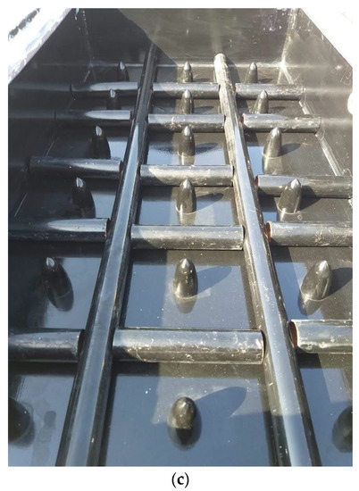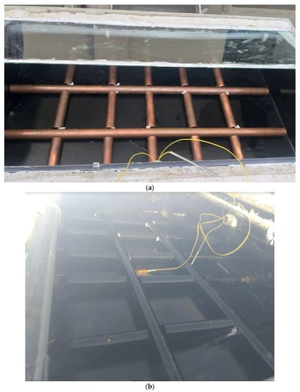 Copper tubes without coating were used in the initial series of experiments (Case I). The MSS coupled with non-coated copper tubes is as described in Figure 2a. The second experimental set (Case II) was performed by coating the copper tubes with black color, as depicted in Figure 2b, and the third experimental set (Case III) was conducted by coupling the basin liner with both coated copper tubes and parabolic fins, as shown in Figure 2c. By enhancing the water depth on each day from 1 cm to 3 cm, each set of experiments was conducted across three days.