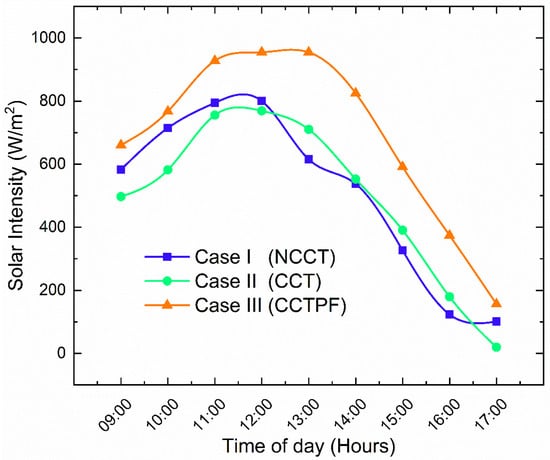 There is a one-to-one correlation between solar irradiation and the surrounding environment’s ambient temperature. The obtained solar intensity values are plotted and depicted in Figure 3. Initially, the solar intensity reported was as low as 497 W/m2 for case II. The highest solar intensity values obtained were 800 W/m2 for case I, 768 W/m2 for case II, and 954 W/m2 for case III. Solar intensity values improved from 9:00 am to 12:00 pm and then decreased. The solar intensities were reported as 100 W/m2 for case I, 20 W/m2 for case II, and 156 W/m2 for case III at the end of the day. The solar intensity curves for all three cases follow the trend of a bell curve.