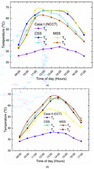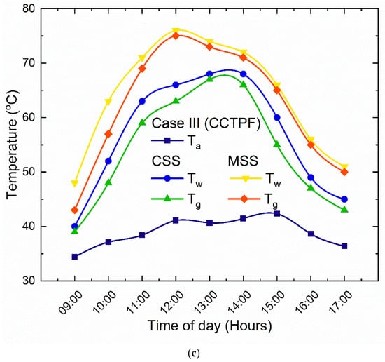 In case II—CCT, the highest temperature values of the water (Tw), glass cover (Tg), and ambient (Ta) for CSS were 66 °C, 62 °C, and 36 °C, respectively, and for MSS, they were 68 °C and 63 °C. It was noticed that the temperature variation in glass and water in MSS was 5 °C, which was the same as case I. But in case II, this variation in temperature was maintained for a prolonged period of time, in contrast to case I, because the coated copper tubes’ (CCTs) powder coating allows them to absorb the maximum solar radiation. In case III—CCTPF, the highest temperature values of water (Tw), glass cover, (Tg) and ambient (Ta) for CSS were 68 °C, 65 °C, and 42 °C, respectively, and for MSS, they were 74 °C and 66 °C. For case III, the temperature variation in the glass and water reached 8 °C in MSS, which was more when compared to case I and case II. The reason is that the augmentation of parabolic fins (PFs) with CCT helped to exchange the energy absorbed with the surrounding water.