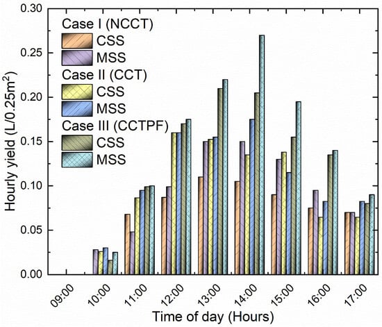 The productivity output gained from the MSS and CSS was collected in two beakers for each still of 1000 mL capacity. One beaker was used to collect the distillate output from the west side, and other to collect the distillate output from the east side. The distillate output collected was recorded hourly. In all the three cases, the highest yield was obtained at 1 cm depth of water, because the heat absorption surface area was higher. So, the heat transfer between the copper tubes, parabolic fins, and surrounding water surface was higher, and the heat transfer between the basin liner and the water was also higher. The hourly and cumulative yield output obtained for all three cases of both CSS and MSS between 9:00 a.m. and 17:00 p.m. is shown in Figure 5 and Figure 6. It can be seen in the hourly yield graph that the maximum hourly distillate obtained at 13:00 p.m. for CSS and MSS reached values of 110 mL and 140 mL for case I, 152 mL and 185 mL for case II, and 210 mL and 270 mL for case III. The difference in hourly distillate yields between CSS and MSS was more in case III, in contrast to case I and case II. The energy exchanges between the basin of the solar still and the NCCT, CCT, and CCTPF are responsible for this phenomenon.