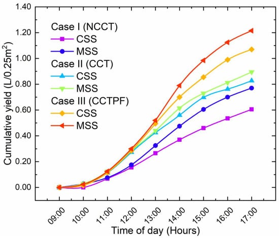Variation in cumulative distillate output concerning time for all three cases.