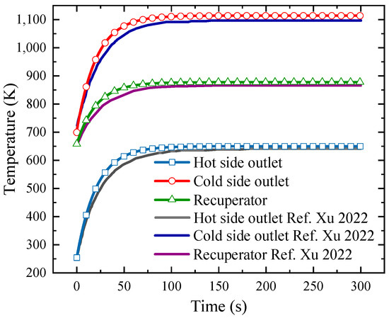 The obtained outcomes are illustrated in Figure 2. It is evident that the calculated values in this paper closely align with the reference values obtained from the literature’s recuperator data. The discrepancy between the temperature at the low-temperature channel outlet and the literature’s maximum reference value is approximately 33.07 K. Meanwhile, the highest temperature difference at the high-temperature channel outlet reaches 26.13 K. Admittedly, a notable relative error exists, and the maximal relative error within the calculated results stands at 4.77%. Nevertheless, this discrepancy remains within an acceptable margin of error, affirming the precision of the recuperator’s calculation model employed in this study.