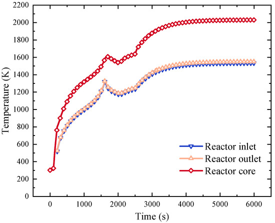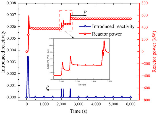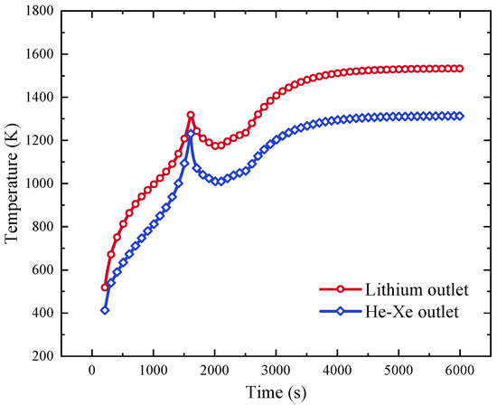 The variation of the reactor core temperature over time is illustrated in Figure 5. Evidently, the core temperature experiences a gradual ascent in tandem with the increase in reactor power. Upon reaching 400 K, the initiation of the liquid lithium circulation loop facilitates the dissipation of some of the core’s heat by the liquid lithium. Consequently, the pace of core temperature elevation decelerates. The regulation of reactor power is achieved through the modulation of core reactivity, ultimately leading to system stabilization as the core temperature persists in its ascent, reaching approximately 2000 K. To avert abrupt fluctuations in core temperature, a substantial liquid lithium mass flow rate is configured. In a stable state, the core power attains 543.86 kW with the reactor’s liquid lithium temperature witnessing a 16.73 K temperature increase.
