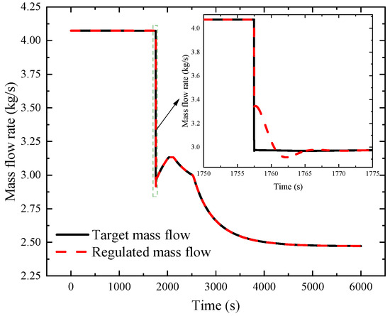 The divergence between the target flow rate and the actual flow rate of the turbine is depicted in Figure 4. In this study, a PID controller is employed to oversee the flow balance between both turbines, thereby achieving system stability. Under conditions where turbine output power aligns with compressor energy consumption, surplus flow is channeled into the power turbine to stimulate alternator-driven electricity generation. During flow regulation, the turbine’s expansion ratio is determined by the pressure differential across the system’s front and back.
