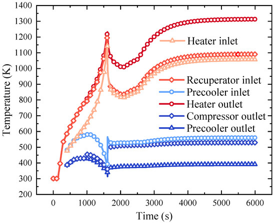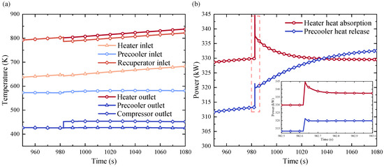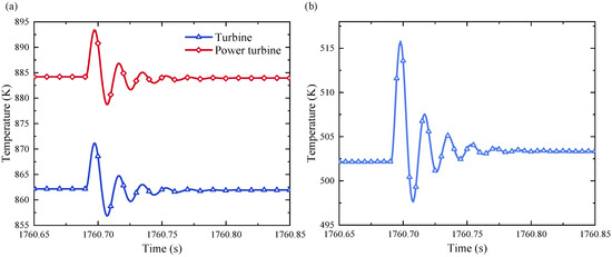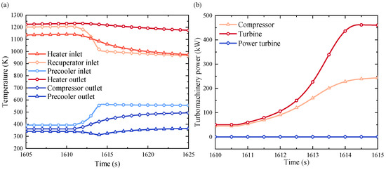 Upon attaining a substantial power discrepancy, the inflow of He-Xe gas into the turbine undergoes modification, with the PID controller orchestrating adjustments to align the turbine’s power with that of the compressor. The He-Xe gas then enters the power turbine, where both turbines undergo expansion at identical pressures, ensuring an equivalent expansion ratio. Nevertheless, owing to variances in turbine efficiency, the temperature of the He-Xe gas upon entering the high-temperature flow channel of the recuperator displays fluctuations. This, in turn, introduces a degree of lag in the flow adjustment process, thereby contributing to the temperature shifts observed. Given that the temperature fluctuation of the He-Xe gas primarily stems from the operations of the turbines and compressors, the temperature alteration within the outlet of the rotating machinery between t = 1760.65 s and 1760.85 s is depicted in Figure 14. The graphical representation illustrates that the process of regulating the mass flow rate within both turbines engenders flow oscillations, thereby inducing temperature vacillations in the He-Xe gas at the entrance of the recuperator. Consequently, the temperature fluctuations extend to the precooler, giving rise to abrupt alterations in the temperature of individual system components. These fluctuations gradually converge as the system components collectively stabilize, resulting in an overall temperature transition in the wake of the fluctuation.