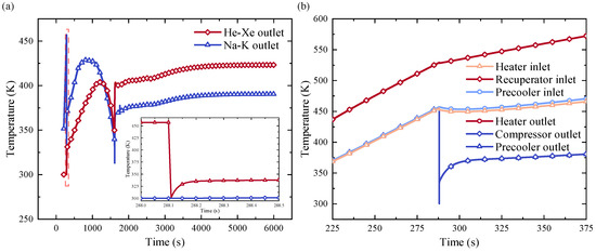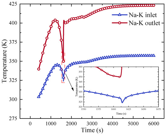 The temporal variation of Na-K temperature is illustrated in Figure 7. When the temperature within the precooler reaches 460 K, the Na-K cycle initiates, serving to cool down the He-Xe. Once the He-Xe attains a cooler temperature, the temperature discrepancy between both sides of the recuperator facilitates its operation. The stored state of Na-K is maintained at 300 K. Given the substantial temperature contrast between Na-K and He-Xe, upon cycle commencement, heat is absorbed from He-Xe, resulting in a gradual temperature elevation within Na-K. This temperature change is then systematically regulated to achieve a stable equilibrium state.