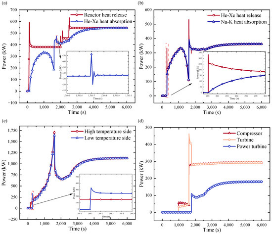 Variation of the power of each component of the CBC system: (a) nuclear reactor; (b) Na-K; (c) recuperator; (d) turbomachine.