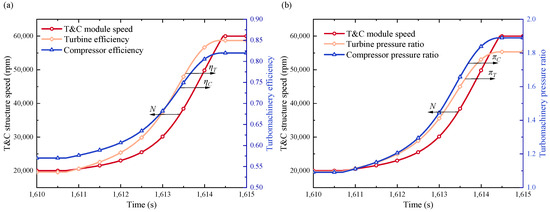 Dynamic characteristics of the T&C module: (a) T&C module speed and efficiency; (b) T&C module speed and pressure ratio.