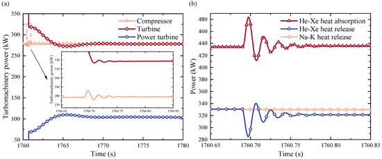 This phenomenon is depicted in Figure 16a. As the temperature of the He-Xe gas entering the turbine’s front inlet rises incrementally, the turbine’s output power experiences a gradual surge. Once the turbine’s power surpasses that of the compressor, the coupling between the T&C module and the alternator is severed, subsequently boosting the T&C module’s rotational speed. Following this phase of stable operation, fine-tuned adjustments to the remaining flow direct it into the power turbine for electricity generation. Consequently, the system’s power generation experiences a rapid upsurge post the time point of 1760.69 s. Subsequently, in response to the escalating reactor power, the electrical output continues to climb, gradually achieving a state of equilibrium.