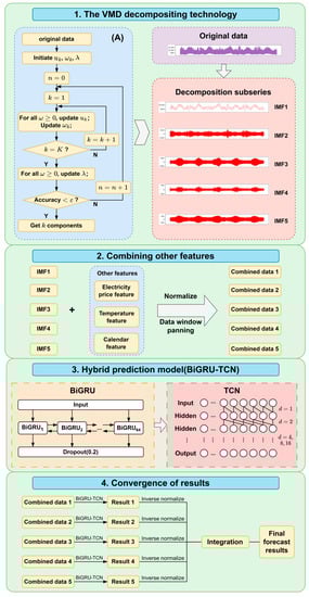Flowchart of the VMD–TCN–BiGRU method. IMF represents termed intrinsic mode function. (A) VMD processing of load data.