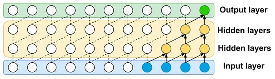 Each node’s data within the hidden layer of the causal convolution correlates only with the data at the same moment and those before it in the subsequent layer. This concept is illustrated in Figure 2. The primary goal of this approach is to mitigate the issue of information leakage that is prevalent in traditional convolutional structures, ensuring that no information from the future leaks into the past.