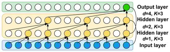 To address the problem of information loss associated with historical data, the TCN model merges dilated convolution with causal convolution. This combination expands the field of view, capturing long-range dependencies within the input sequence. For a one-dimensional sequence , the filter f is f0 to fk−1. The convolution operation F for the sequence element s is as follows: