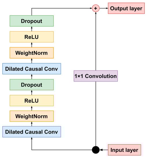 The TCN model introduces the residual block to avoid the problems of information loss and instability caused by excessive network depth. The connection of the residual block is represented by the arc in Figure 3. As depicted in Figure 4, the residual module comprises two layers of dilated causal convolutional layers and their accompanying modules. To rectify the discrepancy of input and output widths, an additional one-dimensional convolution is implemented, ensuring that the two tensors involved in the summation operation (⊕) maintain consistent shapes.