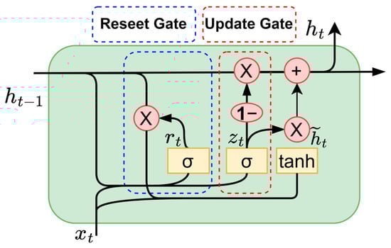 where represents the candidate hidden layer; tanh signifies the hyperbolic tangent function; and indicates the weight of the candidate hidden layer. The structure of the GRU is depicted in Figure 5.