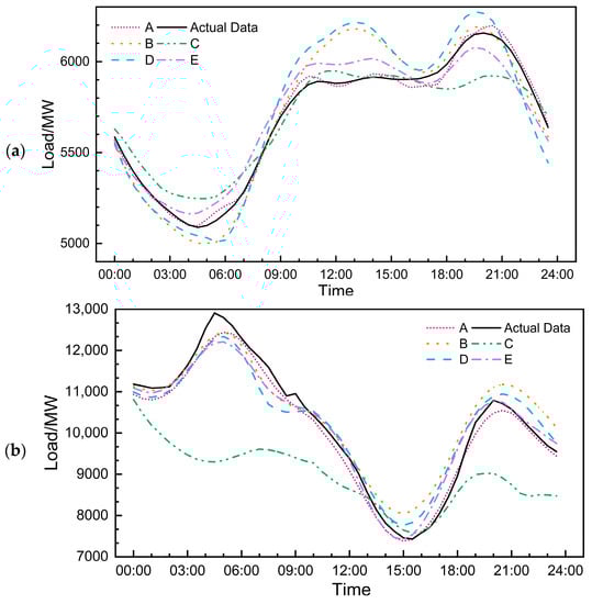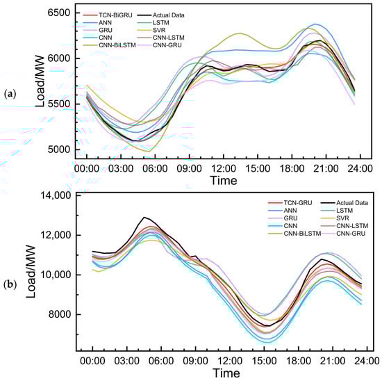 (a) Comparison of prediction results from the load model over 24 h for Dataset 1; (b) comparison of prediction results from the load model over 24 h for Dataset 2.