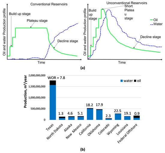 (a) Typical production profile for conventional and unconventional reservoirs (reproduced from Ref. [] with permission from the Royal Society of Chemistry), (b) WOR values in selected states in the USA [].