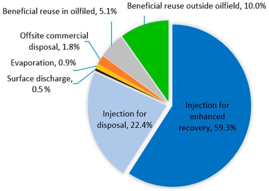 In order to improve the profitability of oilfield exploitation, it is necessary to maximize the use of brine, hence the increasingly advocated “beneficial reuse”, i.e., the use of brine for tank cleaning, preparation of fracturing fluids or irrigation purposes. The perception of produced water is changing and now it is considered as a valuable resource for the production of potable water and valuable chemical elements []. Depending on the volume of brine, geological, reservoir, and technological conditions, as well as local legislation, there are currently several ways to manage this waste stream.