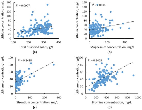In general, there is no relationship between the lithium content and other elements. Therefore, the concentration of lithium cannot be predicted on the basis of simplified analyses of basic ions and must be determined separately for each time. Yu et al. [] created a unique database containing hydrochemical data from 155 oil wells. The statistical analysis of this dataset confirms that lithium concentration has a weak relationship with the salinity and content of individual ions as shown in Figure 3a–d. The correlation coefficient for data shown in Figure 3 is lower than 0.3, which indicates that there is no linear relationship between the lithium content and other variables.