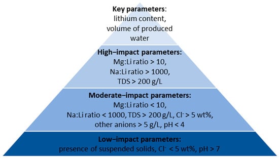 Figure 4 uses the pyramid concept to visualize the importance of the various factors affecting lithium recovery. At the very top are the two most important parameters, i.e., the lithium content in the brine and the amount of brine extracted. These two parameters determine the amount of lithium available, and more importantly, they cannot be easily influenced by applying certain technical solutions. High salinity and increased concentrations of Na+ and Mg2+ ions were identified as high-impact parameters. As explained in Table 2, these ions compete with lithium sorption, and their presence reduces the quality of the final lithium carbonate. Technical solutions are available to mitigate their impact, but they may cause some operational complications. Some parameters, such as pH and the content of other anions, only slightly affect lithium recovery and may be easily adjusted. There are numerous interdependencies between water parameters, and the correction of one of them may affect the others. Overall, Figure 4 and Table 2 provide only general guidelines and each brine must be considered separately.
