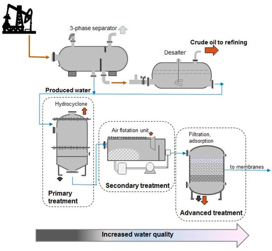 According to the literature [], the mixture of crude oil and water is usually separated in high-pressure three-phase separators. The oil is directed to the desalting and stabilization system while the water goes to the treatment system. The primary treatment includes mechanical methods such as gravity separation or centrifugation. In practice, the gravity method can be used to separate solid particles with a size of 10−1 to 10−3 mm and oil droplets with a diameter of more than 150 μm. In secondary methods some chemicals or gases are applied. Coagulants and flocculants facilitate the separation of smaller particles. Dissolved air flotation (DAF) is also an effective technique to enhance small oil droplets removal. Filter columns are sometimes connected in series—on prefiltration (mechanical) filters solids are separated, while on adsorption beds selected dissolved contaminants (ions, hydrocarbons) are removed. Typical filter beds include gravel, sand, anthracite, diatomite, zeolites, walnut shells, etc. []. The advanced treatment includes chemical adsorption methods and membrane desalination. The combination of primary, secondary and advanced treatment methods improves the quality of water, resulting in potable water.