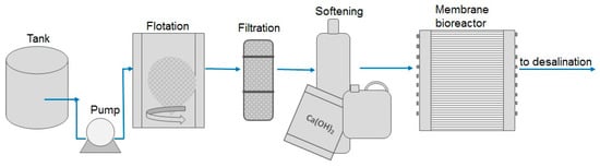Patrick et al. [] described an alternative way to treat water before the membrane process (Figure 6). After using classical treatment methods in the form of the dissolved air flotation process and walnut shell bed filtration, they proposed softening the water with lime and the removal of oil in a membrane bioreactor.