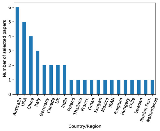 Figure 2 shows the number of selected papers from countries where the solar time series were measured. There are series from 21 different countries, with Australia highlighted in six papers. One can note the presence of different regions of the world, such as North and South America, Asia, Africa, Oceania, and Europe. However, it is important to mention that in 10 out of the 49 selected papers, the authors did not comment on the location of the time series used in the experiment.